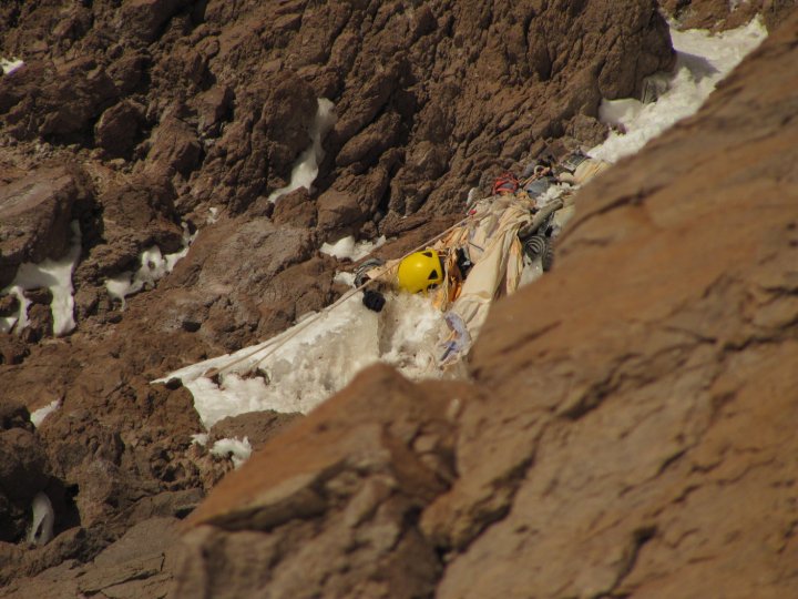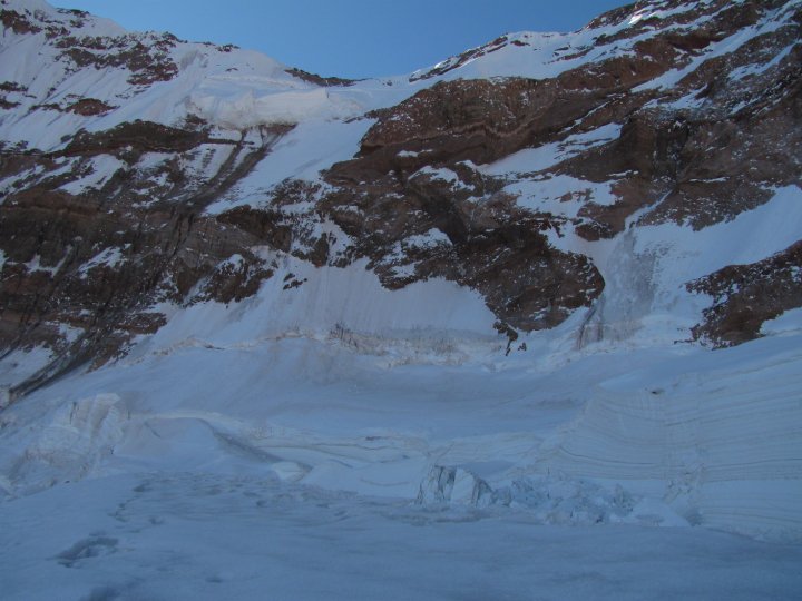 Finalmente el frío cala mis huesos y se hace imposible de soportarlo, tiemblo con espasmos. Reacciono, se que es temprano aún, pero debo ponerme a caminar lo antes posible, son las 2AM, la noche esta cerradísima, no importa, caliento un poco de agua, junto mis cosas. Esa mañana tomo jugo tibio (mis tres saquitos de café se me habían terminado), como un puñado de palitos salados (se me habían terminado mis galletas) y salgo a caminar sin saber por donde, el día anterior no había alcanzado a estudiar un buen cruce. El glaciar se torna un laberinto, para hacer un cruce hay que realizar unos zig zags, eso lo aprendí después, por el extremo derecho del glaciar es imposible, las grietas muy grandes. Hay que ir al extremo izquierdo, no hay otra, por más que uno se aleje mucho de la rampa hacia el mixto Mesnner. Me desanimó un poco al tener que ir y volver sin sentido, se que cada gasto de energía se paga caro. Luego se realiza una travesía hacia la derecha, debajo de una gran rimaya, hasta encontrar un cruce. En este sector la pendiente comienza a ser de unos 50° a 60°, hasta llegar al mixto, no es necesario tocar la piedra, los canales de nieve te van conduciendo, un poco tirados a la izquierda. Casi saliendo de aquí hay dos canales, uno ciego, que si toman este es de 10 metros, deberán destreparlo y tomar el siguiente, que pasa muy cerca de los cadáveres de lo brasileros. Eso hace recordar la exposición a las avalanchas. Justo cuando creía que no faltaba nada, que claro mensaje, nada de confiarse incluso hasta no estar en plaza argentina. Ahora tan solo quedan unas 5 horas en la pala. Decido pasar por el cuello de botella que se forma con el gran serac y una banda rocosa. Esta parte se puede sortear por la derecha de la banda rocosa o si se ve muy peligrosa se puede desviar a la variante eslovena hacia la izquierda. La nieve es muy onda en esta parte, metro y monedas. Y no tiene mucha cohesión. Se me hace eterna esta parte, doy cuatro pasos y me tiro de cara a la nieve. Estoy agotado y las nubes se cierran sobre esta ultima parte, no corre viento y se produce el fenómeno de sofocación de glaciar. La temperatura sube rápidamente por la refracción de la luz en las nubes y la nieve, es el efecto invernadero. Me sofoca el calor y comienzo a sacarme capas de abrigo, lo que me alivia un poco.
