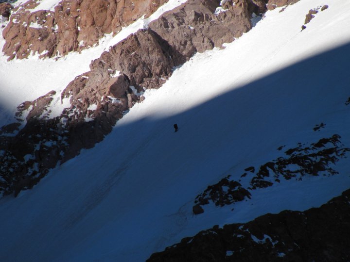 No tengo más agua hace unas horas y las condiciones del terreno no dan descanso, ni pienso en realizar una repisa, tengo que seguir. 100 , 50 , 20 metros… finalmente salgo… se terminó. Se siente bien el aire fresco que viene en ráfagas del otro lado. El hongo se formó sobre el Aconcagua y debo bajar. Afortunadamente mi amigo Mauri Pareras me espera con una Coca y comida por la ruta normal. El subió en 6 hs 10 min desde plaza argentina a la cumbre. Todo un récord, la montaña esta buena ese día, gracias. Se sale por el filo y el camino de regreso por la normal se encuentra a nuestra derecha a unos 50 o 100 mts. Cuidado con el descenso los primeros metros.