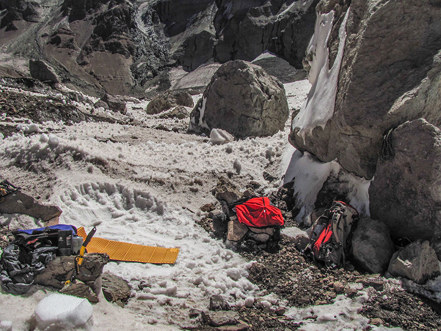 Busco lugar para acampar, las pircas de Plaza Francia no me convencen, necesito estar más cerca de la pared, me acerco bastante hasta la base, el día siguiente iba a ser largo, no quería regalar nada, me acerco al canal donde caen más avalanchas y encuentro unas rocas que me ofrecerían la protección necesaria en caso de una avalancha, o eso creía yo, jeje. Tengo tiempo para secar mi ropa, y sacar fotos del comienzo de la pared, la cámara que compre recientemente me ayuda, tiene un zoom que me permitió descubrir rastros de cuerdas dejadas en antiguas expediciones, me aclara un poco el confuso panorama que se me presenta para entrar a la pared.