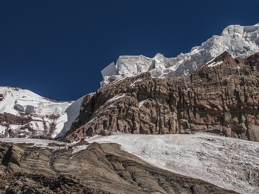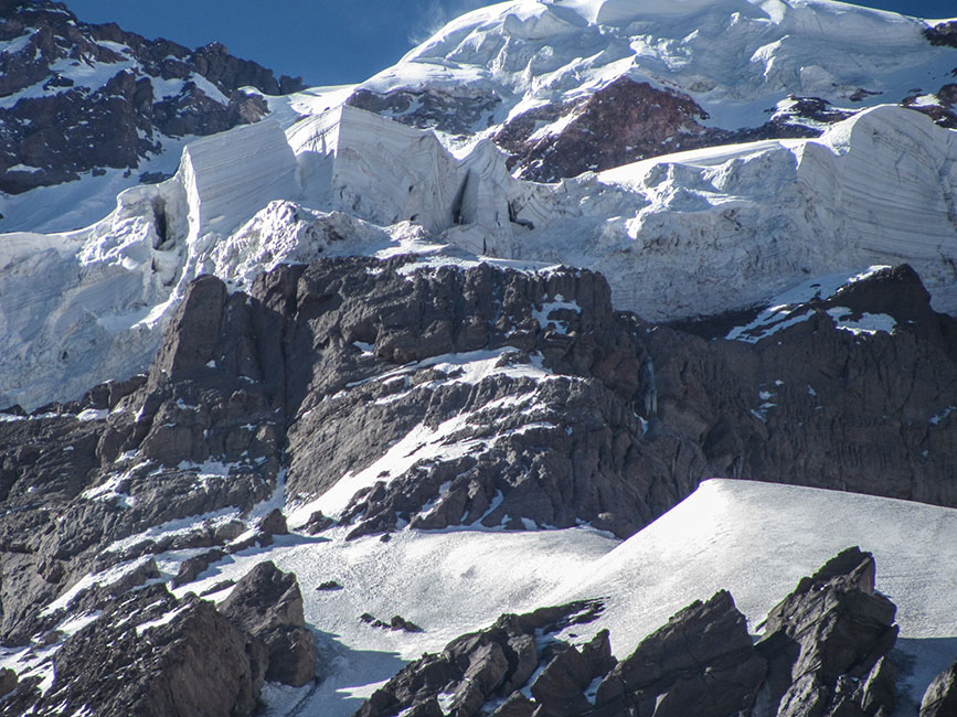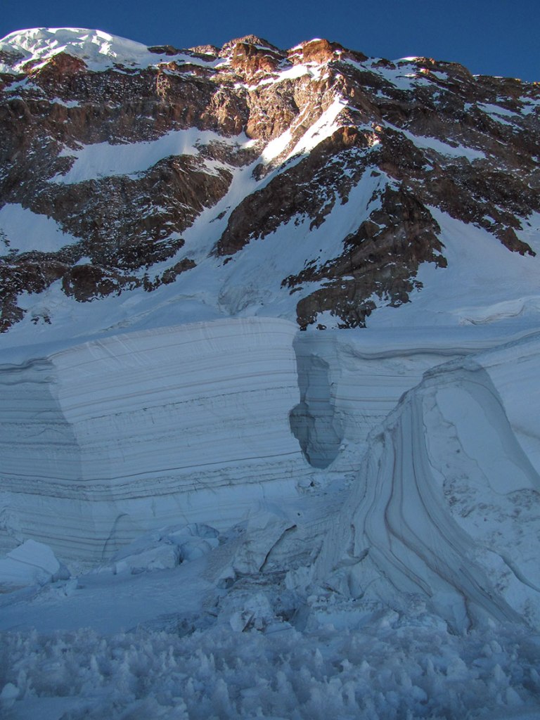 Dejo de escalar en hielo, pero aún con mis crampones puestos sigo escalando unos V de una mala roca sedimentaria, en el silencio de la noche escucho como se desprenden y ruedan grandes pedazos de roca así la rimaya que se encuentra al final de la pendiente en la que me encuentro, “no quisiera correr la misma suerte», pienso. Trato de diseñar una ruta en base a las fotos y a las figuras que apenas se vislumbran, en un lento amanecer. Por un lado quiero que se retrase todo lo posible el amanecer, el hielo sobre el que estoy parado es firme y quiero que así siga. Por otro lado el no ver desespera un poco.